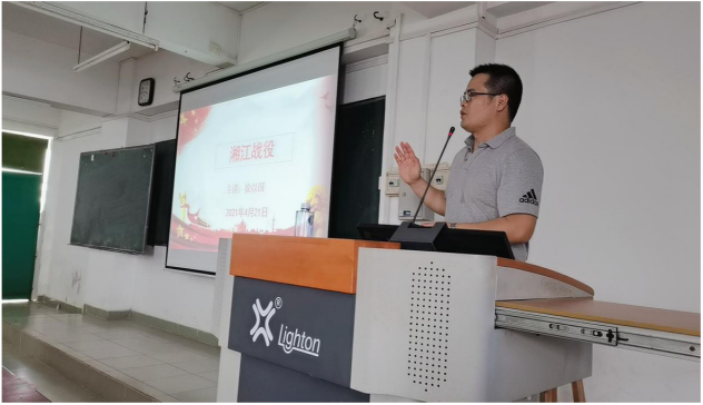 接下来,徐以国老师为大家讲述了红军长征以来关乎中央红军生死存亡的最壮烈的关键一战——湘江战役。徐以国老师对湘江战役的历史背景、战争过程及其影响进行了讲解,其中重点谈到了红军师长陈树湘不愿当俘虏,自甘断肠明志的英勇事迹,用坚定的理想信念诠释了中国共产党人的初心和使命。徐老师还播放了相关影像资料,让大家感受到革命先烈对党对革命事业的无限忠诚、中国共产党人勇于胜利的坚定理想信念、勇于突破、敢于纠正错误的自我革命勇气和勇于牺牲的伟大革命精神。