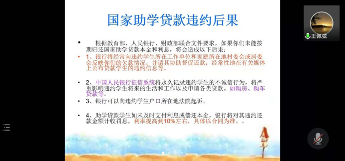 在本次大会上,王佩弦老师首先细心地提醒毕业生注意系统新生成的还款支付宝账号和及时登录还款支付宝账号进行实名认证,并要求大家特别留意接下来关于每年12月还本还息的通知。随后,王老师给同学们详细讲解了助学贷款自付利息时间和利率、支付利息时间和方式、助学贷款本金偿还方式等相关事项以及提前还款的具体操作。最后,王老师通过举例向同学们说明了国家助学贷款违约的严重性,告诫各位毕业生离校后应按时按量还款,以免个人征信受到影响,继而影响日后购房购车贷款等多种严重后果。