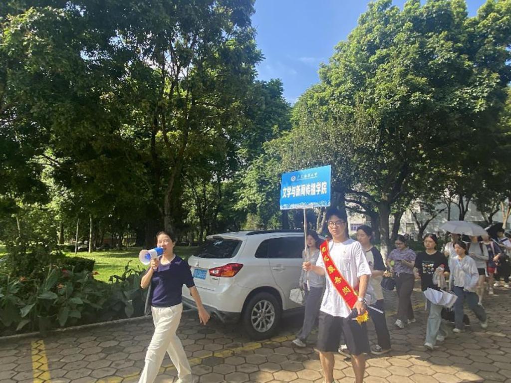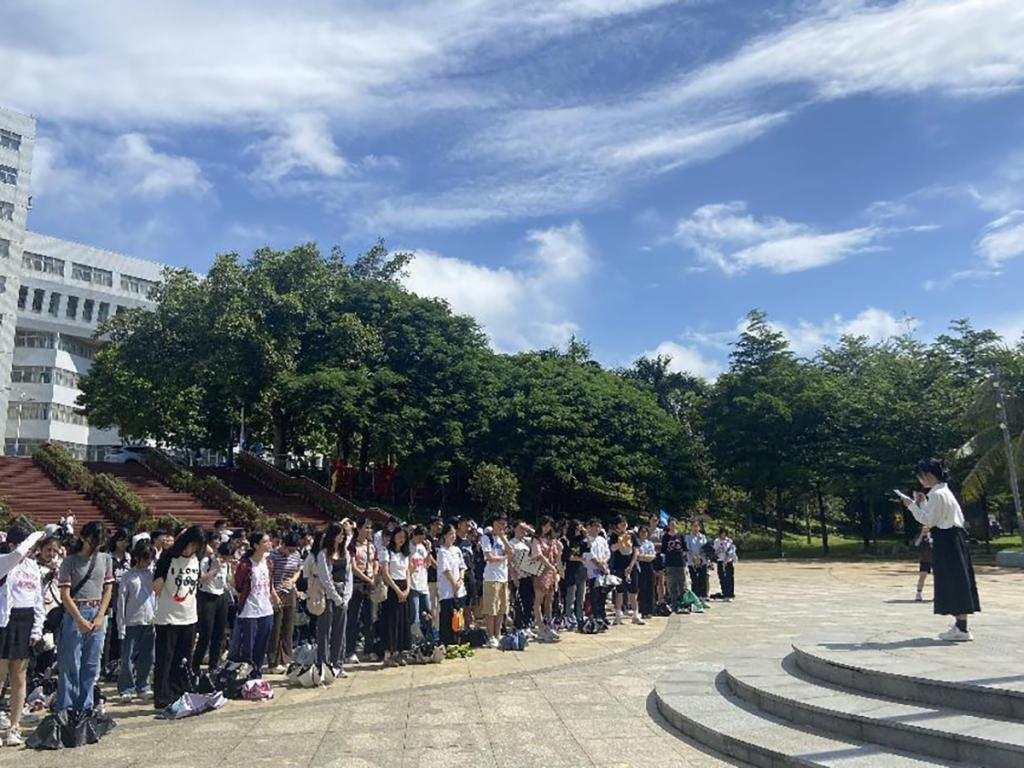 本次校园行的路线经过明德楼、钟海楼、广学楼、图书馆、中心广场、海洋广场等校园标志性建筑。在校园行的过程中,新同学们怀揣美好憧憬游览校园风光。辅导员和各班班助作为新生导游,介绍了主要校园建筑的外形特征和功能。崔文婷、林婉芳两位新生辅导员老师,在介绍公司基本情况的同时与新同学亲切互动。