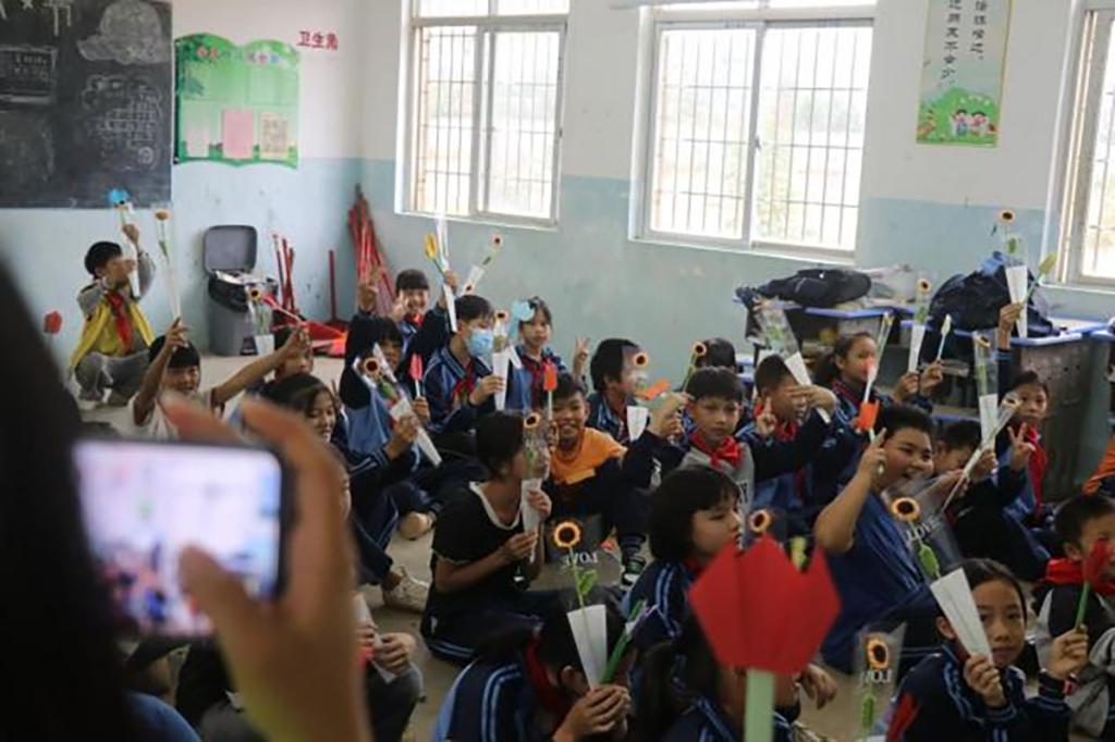 ,此次活动共设两个环节,第一个环节是学古诗识花卉,第二个环节是学习郁金香折纸和手势舞。志愿者们通过教小朋友们学古诗,引起他们对古诗中描写的多种花卉的兴趣,同时通过展示花卉实物图片,帮助小朋友们感知古人体物之深、摹写之工、传神之美,还通过有奖互动鼓励小朋友们积极参与。折纸和手势舞学习,同样注重调动孩子们动手参与的积极性,达到寓教于乐的目的。在指导小朋友们完成折纸后,志愿者们送上自己示范编织的向日葵花,希望小朋友们像向日葵一样向阳而生、健康成长。活动结束后,志愿者们给黄桐希望小学送上盆栽和笔记本,作为本次活动的纪念。
