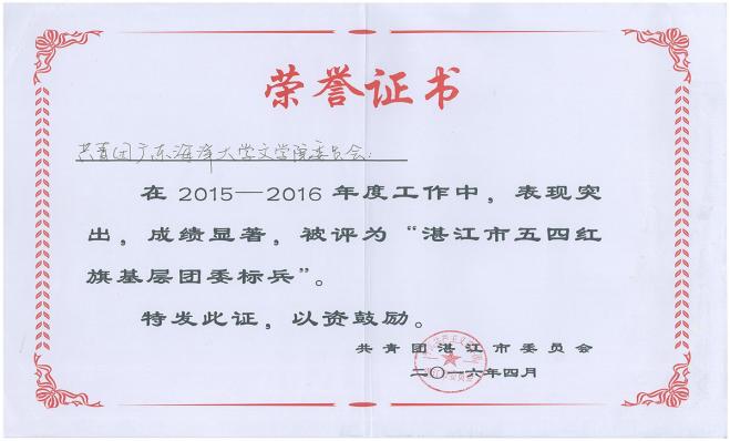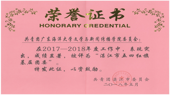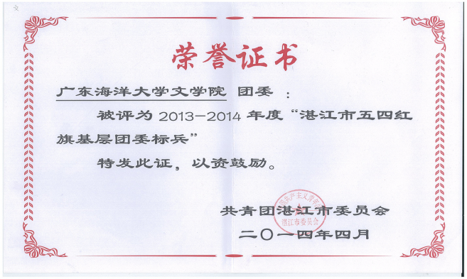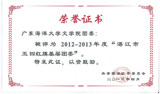 院团委曾获得2013~2014年度、2015~2016年度、2020~2021年度“湛江市五四红旗基层团委标兵”,2012~2013年度、2017~2018年度、2021~2022年度获得“湛江市五四红旗团委”等荣誉称号。院青年志愿者协会曾获得第二届湛江市“先进志愿服务组织”荣誉称号。